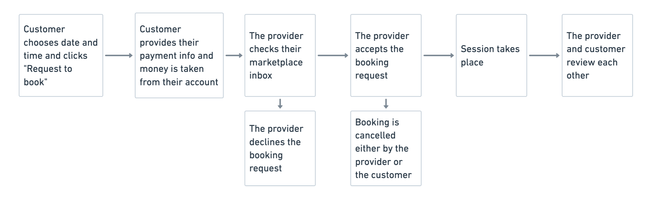 User journey for Yogatime, the Flex template for booking services or renting products by the hour