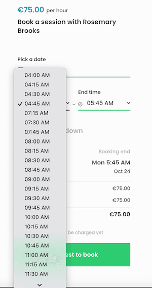 Having this kind of setup then means that the slots are, in practice, bookable every two hours. If we do not want to leave extra gaps between bookings beyond the buffer, we can set start times to repeat on the buffer time cadence instead of hourly. That way, if someone books the 8 AM - 9 AM slot, the next available start time is 9.15 AM i.e. right after the buffer.